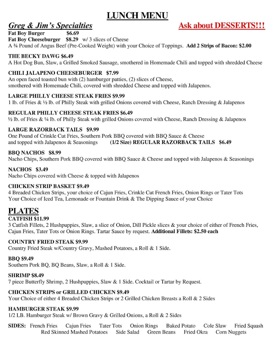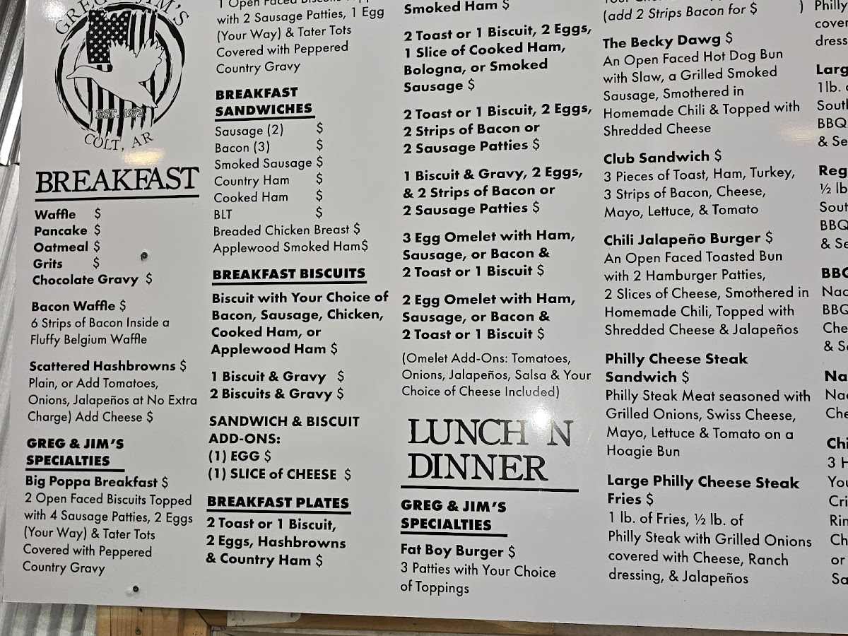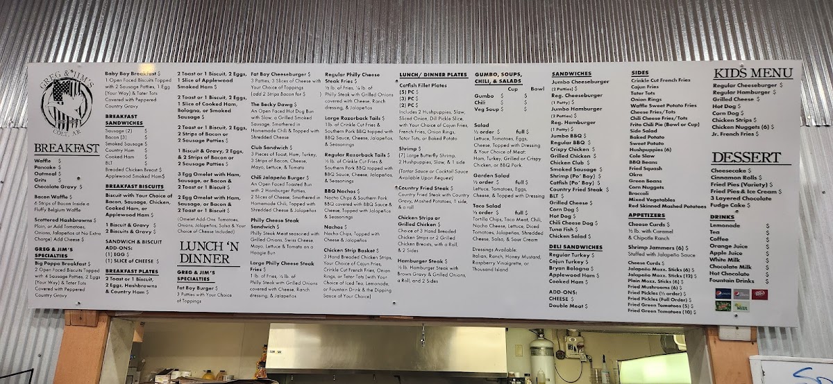 You’ll find that the Greg And Jims Restaurant Menu leans into hearty Southern-style comfort food, the kind that feels both familiar and satisfying from the first bite. Located at 46 Old Military Rd W in Colt, Arkansas, this local favorite keeps things simple yet full of flavor. Think golden-fried catfish served alongside hush puppies, or juicy burgers stacked high with all the fixings. The breakfast options stand out too - fluffy pancakes, crispy bacon, and made-to-order omelets that locals swear by. Everything here comes in generous portions, and it’s clear the kitchen values traditional recipes over modern fuss. Whether you’re stopping in for a casual lunch or winding down after a long day, the menu carries that small-town charm that’s hard to fake, with dishes that taste just like home-cooked meals should.